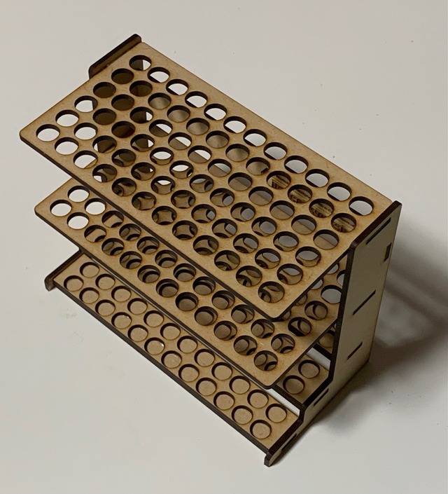 筆を縦に立てて置けるブラシスタンド、ペイントブラシスタンドPROに新製品が加わりました。 9mmスタンドが6列6本計36本、太いドライブラシ等用の13mmが3列6本計18本、さらに最前列に短い筆を刺して置ける9mmスタンドが11本、計65本差しておくことが可能です。 また最前列を除く前から2列ごとに高さが付いているため、選んだ筆を取りやすくなっております。 また、底部にも穴が空いているため、筆がずれる心配もありません。 9mm径部分は特にゴッドハンドの神ふで、神ふでショートの使用を想定して調整してあります。 組立キットでのお届けとなります。組み立てに際して木工用ボンドが必要となりますので、別途ご用意ください。 個数 1個 部品数 11個 材質 MDF2.5mm厚 サイズ 幅159mm×奥行86mm×高さ118mm ※レーザーカットの際のコゲ等がついている場合がございます。ご了承ください。 ※写真2枚目の筆は付属しません。 ※パッケージの厚さ 15mm