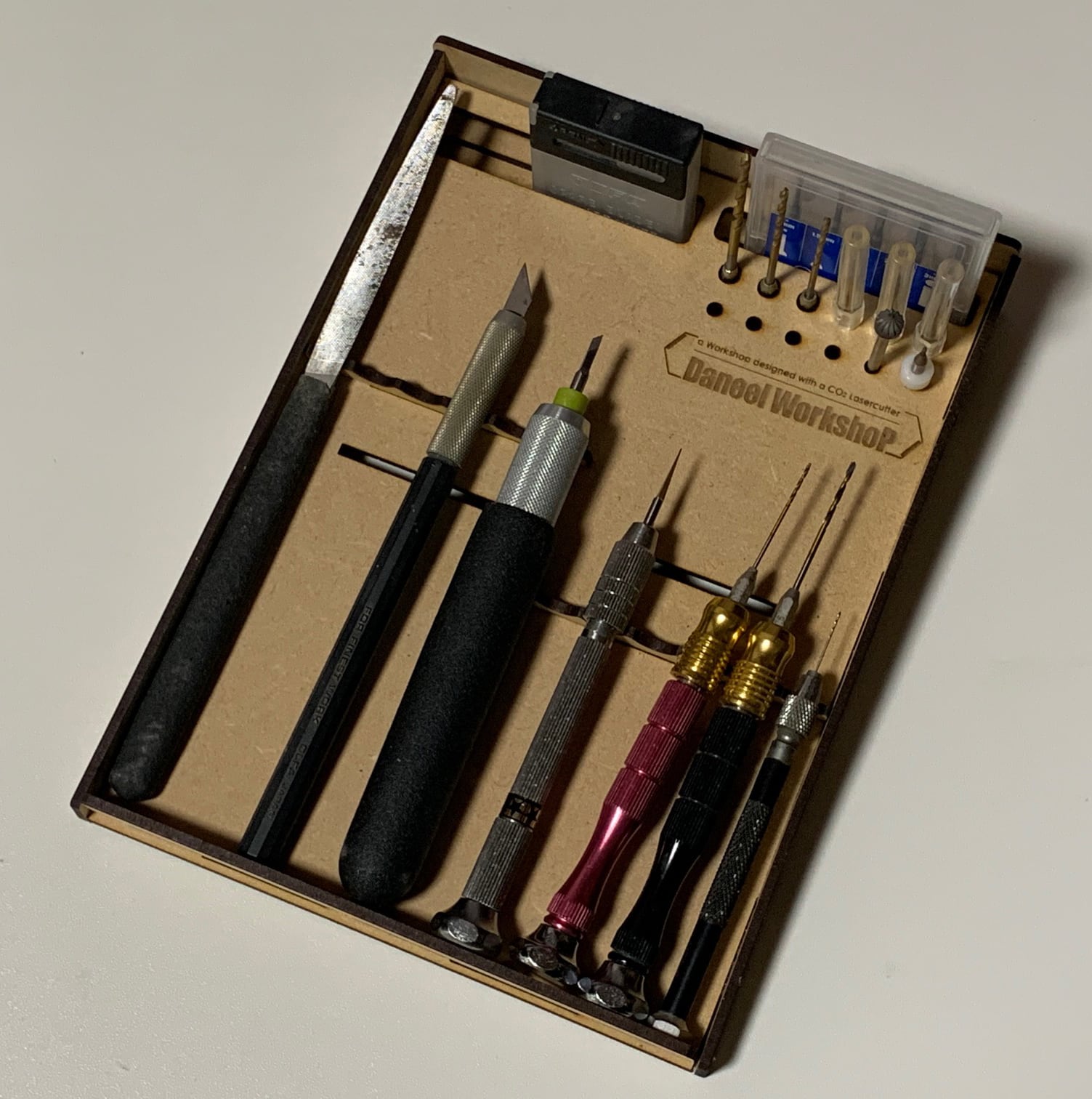 上部には2種のスリットがあり、アートナイフの替え刃ケースやピンバイス用ドリルケース等を立てて置けるようになっております。またその下には直径5ミリの穴と、直径3.2ミリの穴が開いており、ピンバイスやモーターツールの先端ビットやスジボリ用ツールなどを差して置けるようになっております。